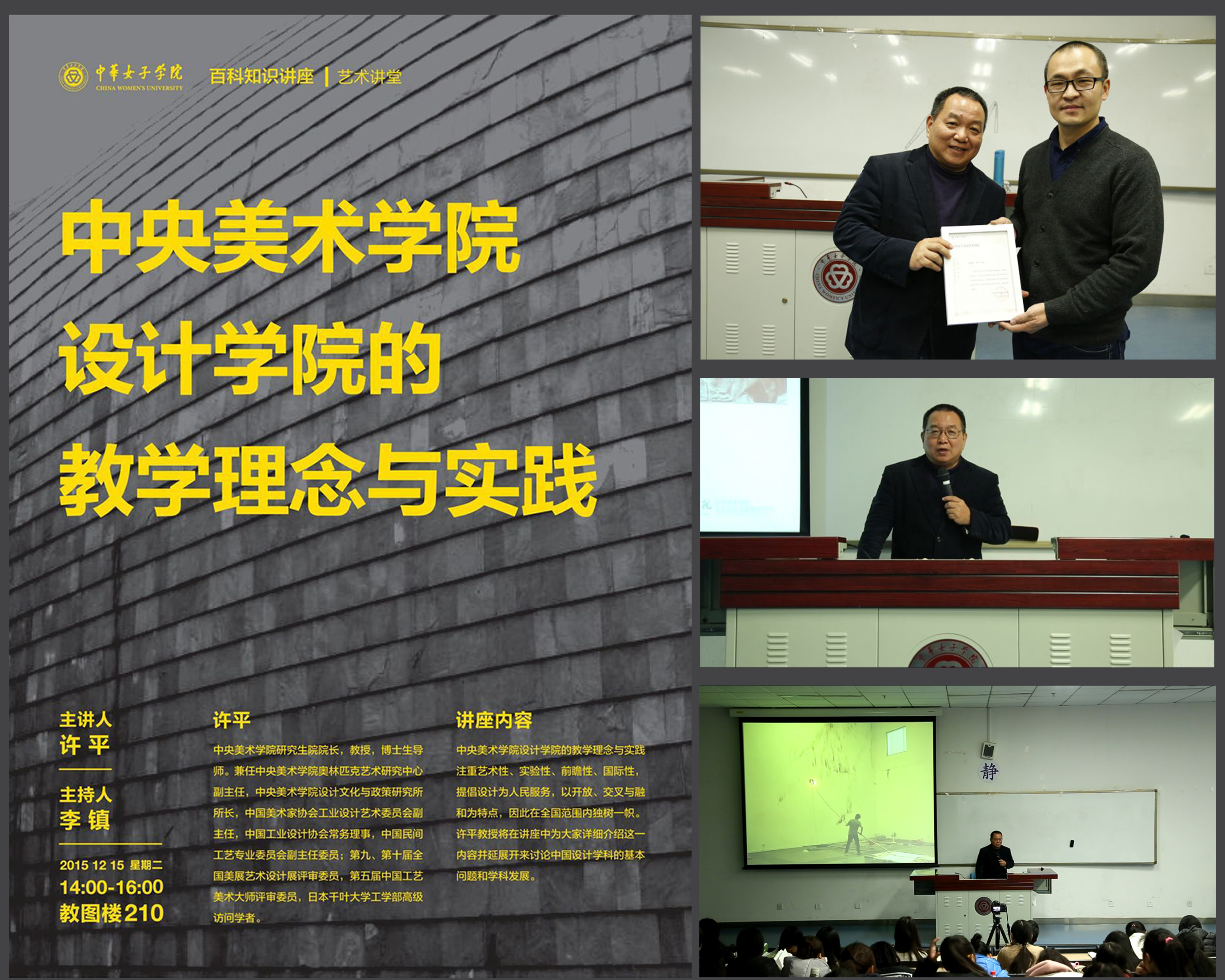 2015年12月15日在教图楼210教室,许平先生进行了题为“让设计成为一种修养:中央美术学院设计学院的教学理念与实践”的学术讲座。