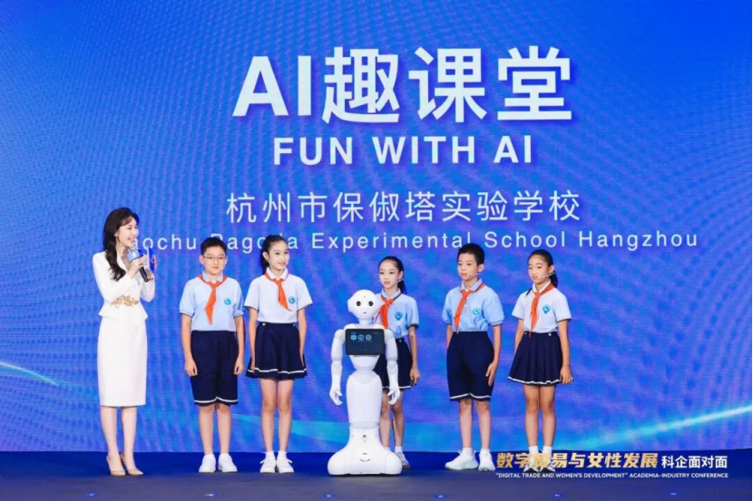 对话在儿童友好观察团充满科技感的《AI趣课堂》表演中开启,来自杭州市保俶塔实验学校的孩子们与自己编程的机器人的互动生动展现了人工智能通识教育的成果。杭州宇乐星球科技有限公司负责人张华分享了如何通过AI技术,让孩子们在“玩中学、做中学”,培养面向未来的创新思维。扶摇职上教育科技创始人、CEO钱天然以一个母亲的视角,分享了母亲以自身的好奇心带领孩子探索技术的温暖故事。尼日利亚Faslearn在线教育平台创始人Chikodili Thelma Ibeh分享如何通过AI通识教育、轻量化技术,培养面向未来的数字素养,消弭教育鸿沟。