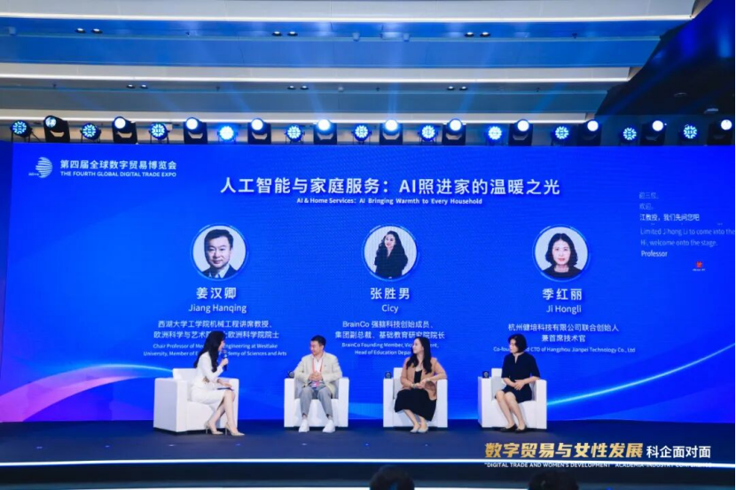 对话交流环节,围绕数字教育、人工智能与家庭服务、数字电商、数字+妇女组织四大板块,开展了四场科企面对面对话交流。