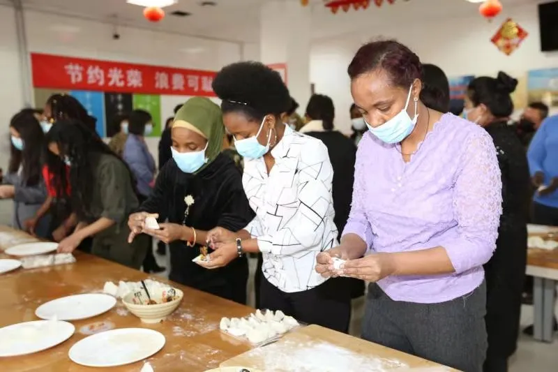 到校后,夏杰听说国际学生们正在热火朝天地学着包饺子,便直奔餐厅看望大家。她边手把手地教同学们擀皮儿、放馅料、捏褶子,边向大家介绍春节这一中国最盛大的传统节日风俗文化。很多同学都是第一次体验包饺子,听得很认真,学得也很认真,还学会了在普通的荤素馅料中加上几颗彩色的巧克力豆,把对新年的美好祝福和对消除疫情的真诚愿望,亲手包裹在一只只形状不同的饺子中。