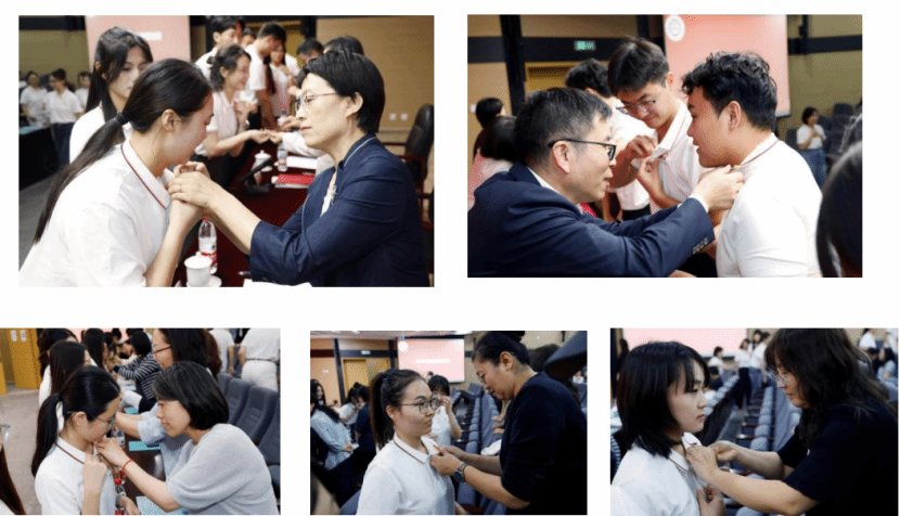 在悠扬的校歌声中,最为激动人心的环节到来——为新生佩戴校徽。校领导与老师们为新生代表逐一佩戴上熠熠生辉的校徽。校徽不仅是学子身份的象征,更承载着学校的传统、精神和期望,寓意着荣誉与责任并重。戴上校徽,象征着同学们与学校血脉相连,共同奋进。