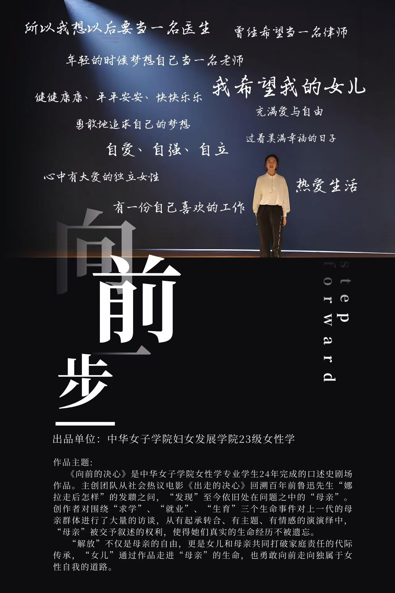 由中华女子学院妇女发展学院女性学专业学生创作的口述史剧场作品《女性,向前一步》成功入选由中国传媒大学主办的第十一届中国口述历史国际展。作品以独特的女性视角、鲜活的妇女故事与深刻的人文内涵,在国际舞台上展现了中国青年学子的学术探索与创作实力,更让当代妇女的生命力量与精神觉醒被看见、被听见。
