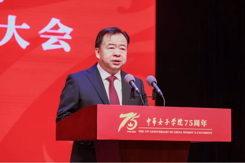 中国传媒大学党委书记廖祥忠代表兄弟院校致辞,对中华女子学院建校75周年表示热烈祝贺。他在致辞中表示,学校始终与党同心、与时代同频、与妇女事业同行,展现了新中国女性“巾帼不让须眉”的豪情壮志和追求卓越、心系家国、服务社会的奋斗精神,在探索女性成长成才规律、践行男女平等、服务妇女全面发展中作出了不可磨灭的贡献。两校有着共同的红色基因、共同的价值追求、共同的使命责任,为推动全球女性教育及构建人类命运共同体作出了积极贡献。他期盼中华女子学院在新征程里,不断汇聚学科优势和人才优势,谱写建设“一流女子大学和国家级干部培训学院”的新篇章,开启助力妇女事业高质量发展的新纪元。