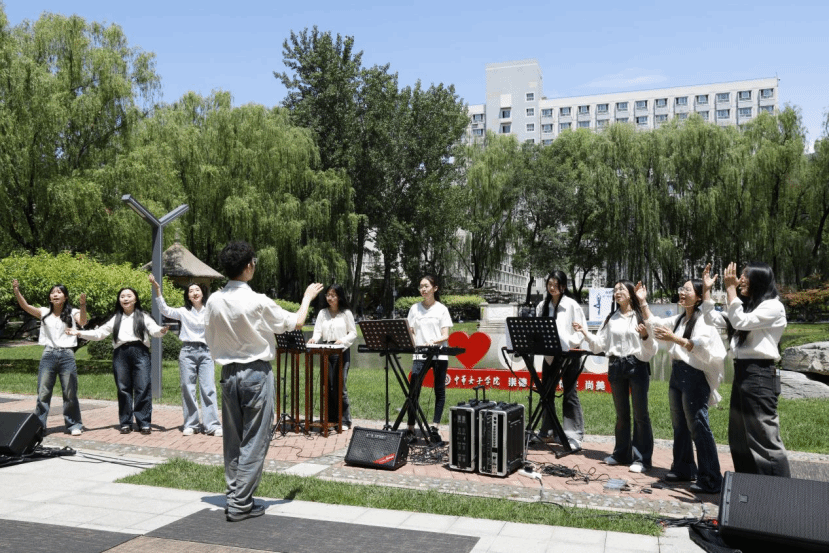 来自首都18所高校的100余名学生环绕育慧湖共同展示了瑜伽集体一级表演。